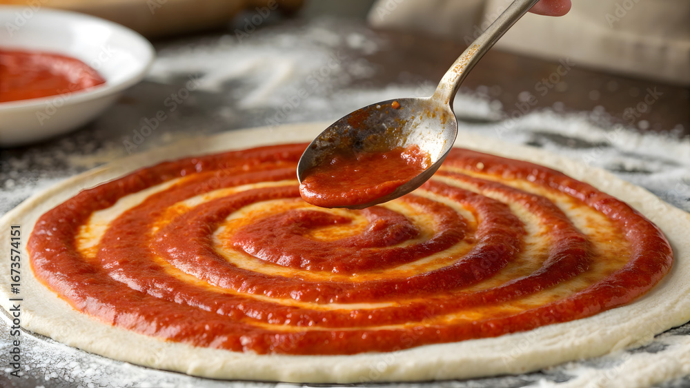 Plakat do Pizzerii - Close up of hand spreading tomato sauce in a spiral on pizza dough #1673574151