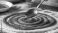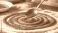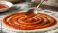 • Close up of hand spreading tomato sauce in a spiral on pizza dough