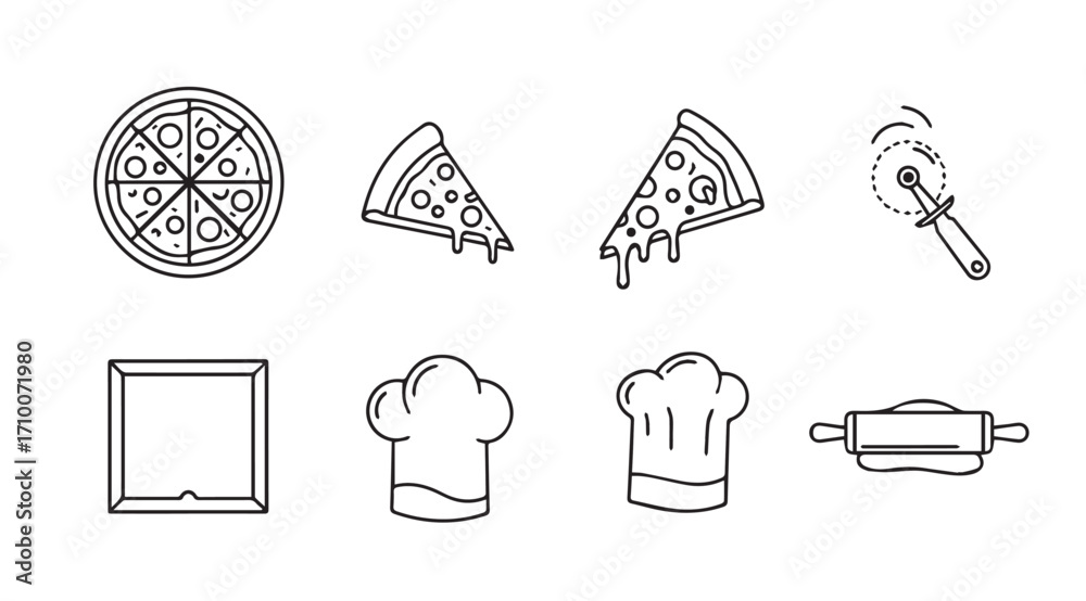 • Collection of hand drawn pizza and baking utensil icons in silhouette