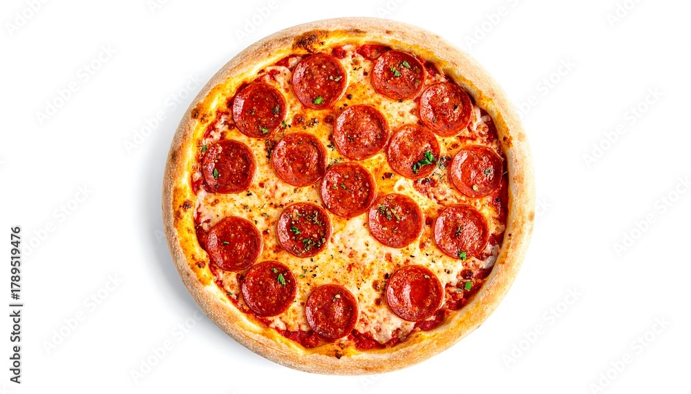Plakat do Pizzerii - Delicious Pepperoni Pizza on White Background, Top View. #1789519476