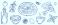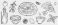 • Hand drawn Italian food with pizza with tomato and basil toppings. Mediterranean ingredients olives, lemon, pasta, coffee, and fresh herbs. Vector sketch illustration in vintage crayon charcoal style