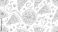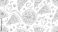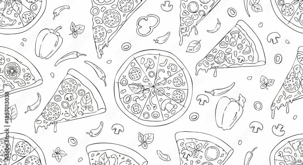 • Delicious pizza slices and whole pizzas line art pattern.