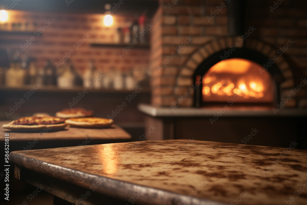 Plakat do Pizzerii - Wooden table for product pizza display, pizza oven, generative AI #586521818