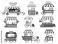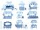 • Street vendor booths. Outdoor local market stalls and fast food kiosks. Festival food court cartoon vector illustration set