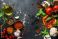 Plakat do Pizzerii - Food ingredients and spices for cooking Italian pizza on a black concrete background. #771007638