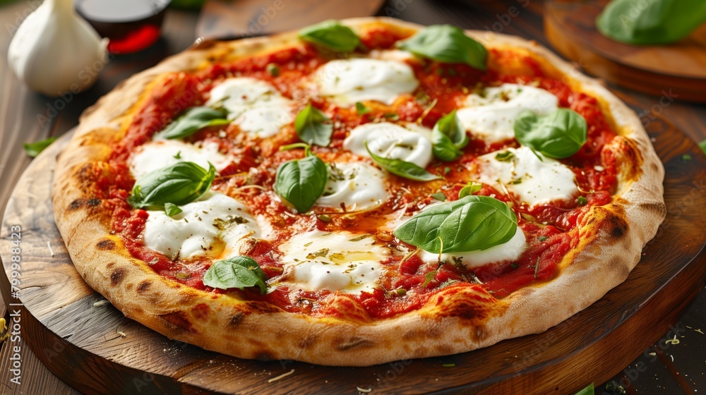 Plakat do Pizzerii - Delicious margherita pizza with fresh basil and mozzarella cheese on a wooden board. #799988423
