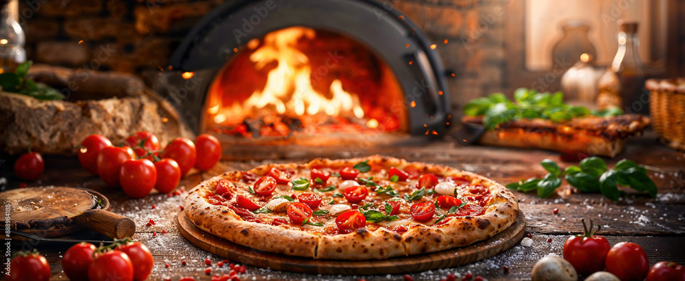Plakat do Pizzerii - belle pizza tomates basilic qui sort tout juste d'un four au feu de bois #888984188