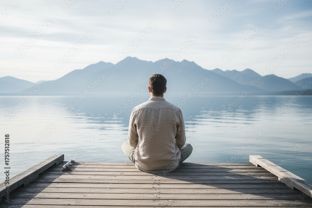 Plakat do Pokoju Chłopca - Man meditating on a wooden pier looking at a mountain lake. Back view of a person relaxing in... #1757512818