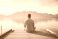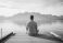 • Man meditating on a wooden pier looking at a mountain lake. Back view of a person relaxing in nature. Solitude and mindfulness concept