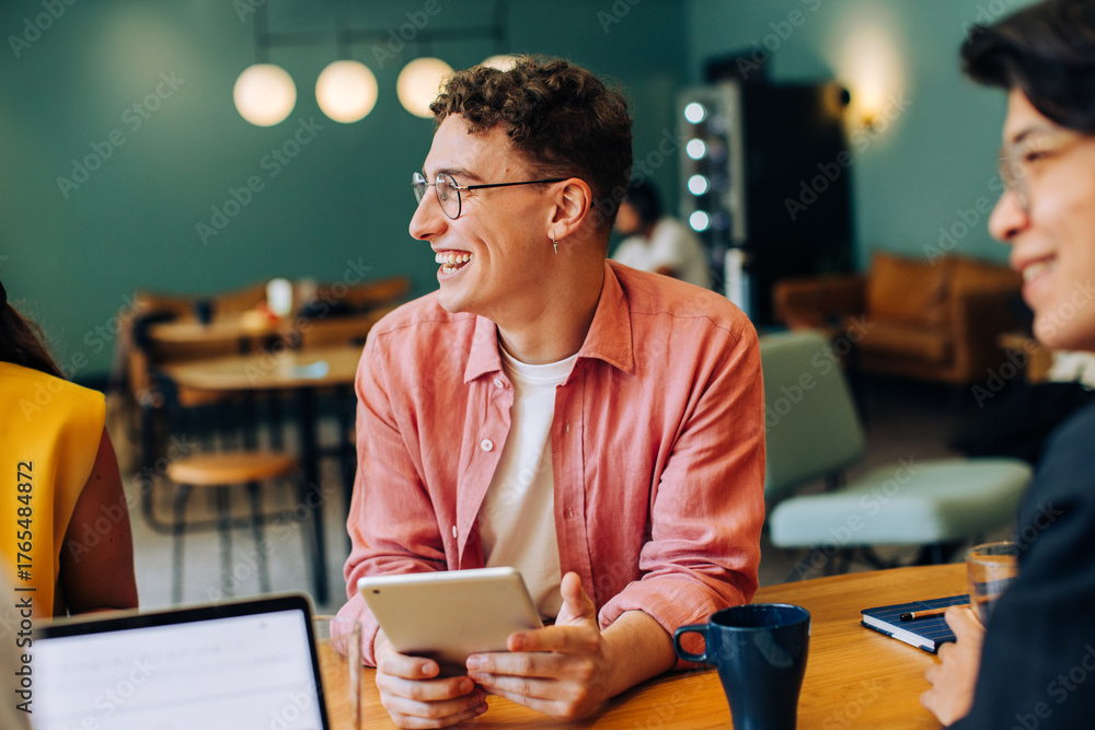 Plakat do Pokoju Chłopca - Smiling colleagues discuss ideas during a cheerful meeting in a trendy cafe #1765484872