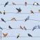 • Birds sitting on electric power lines, seamless pattern. Repeating print, endless background design with sparrows, pigeons, bullfinch species in rows on wires. Printable flat vector illustration