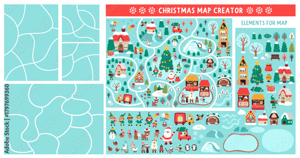 • Christmas village map or scene creator. Set of cartoon elements for constructing winter holiday activity page. Vector New Year clipart with roads, fir tree, Santa Claus, houses, fair, animals, elves