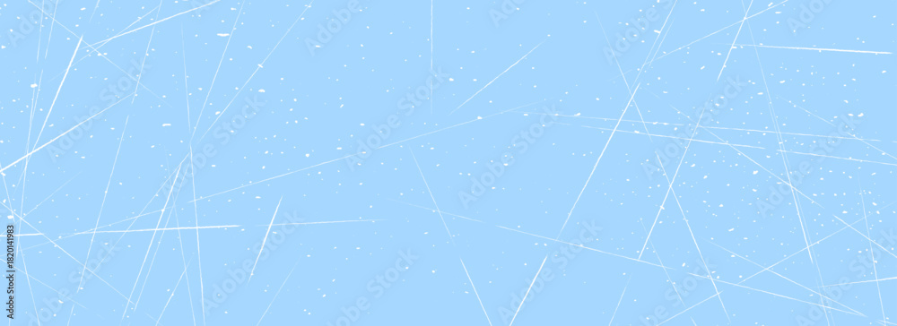 • Scratched ice surface texture. Blue icy background with skate traces, cracks, scratches. Rough winter sport rink backdrop. Frozen lake or pond water wallpaper with dots, spot and lines. Vector