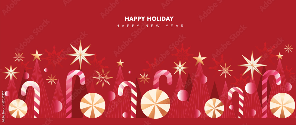 • Christmas vector greeting card illustration with red background, candy canes, stars and festive sweets for Happy New Year — bright holiday design