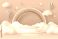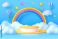 • 3d kids podium with sky clouds and rainbow, floating hot air balloons and twinkle stars. Cartoon vector background in cute childish toy style with round stage or pedestal under blue cloudy sky