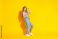 • Smiling young girl poses joyfully against a vibrant yellow background in casual and stylish attire, representing happiness