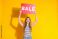 • Young woman holding a sale sign on yellow background showcasing excitement for shopping and promotions