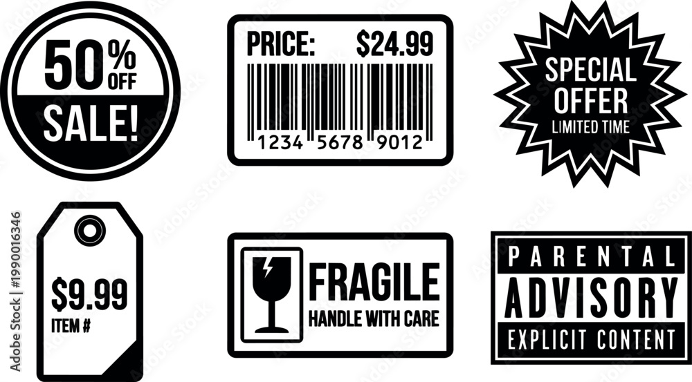 • Black and white sale price barcode fragile and parental advisory labels vector art