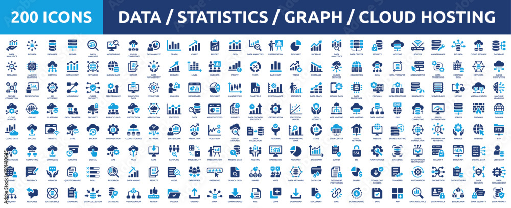 • Huge set of 200 solid icons. Mega collection concept of data, statistics, analytics, cloud computing, chart and graph. Vector illustration.