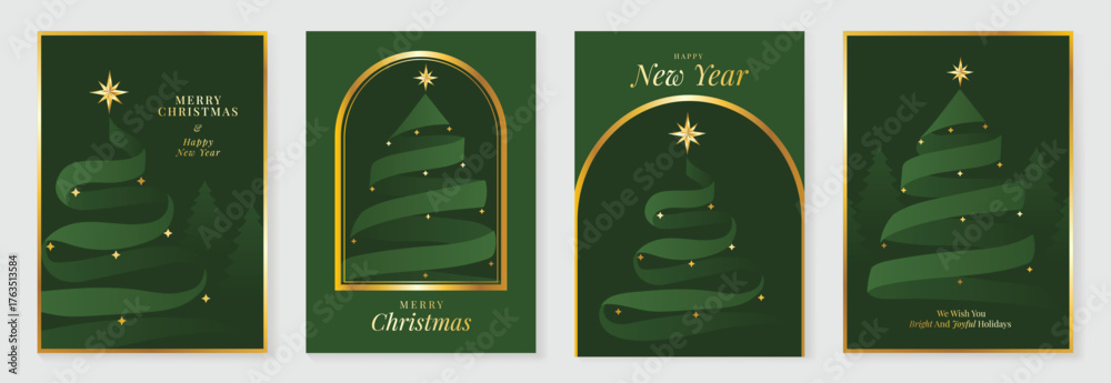 • Luxury Christmas and New Year Greeting Card Vector Set with Golden Ribbon Pine Tree in Green Background for Invitations, Posters, Wall Art, Social Media, Packaging, and Holiday Decorations