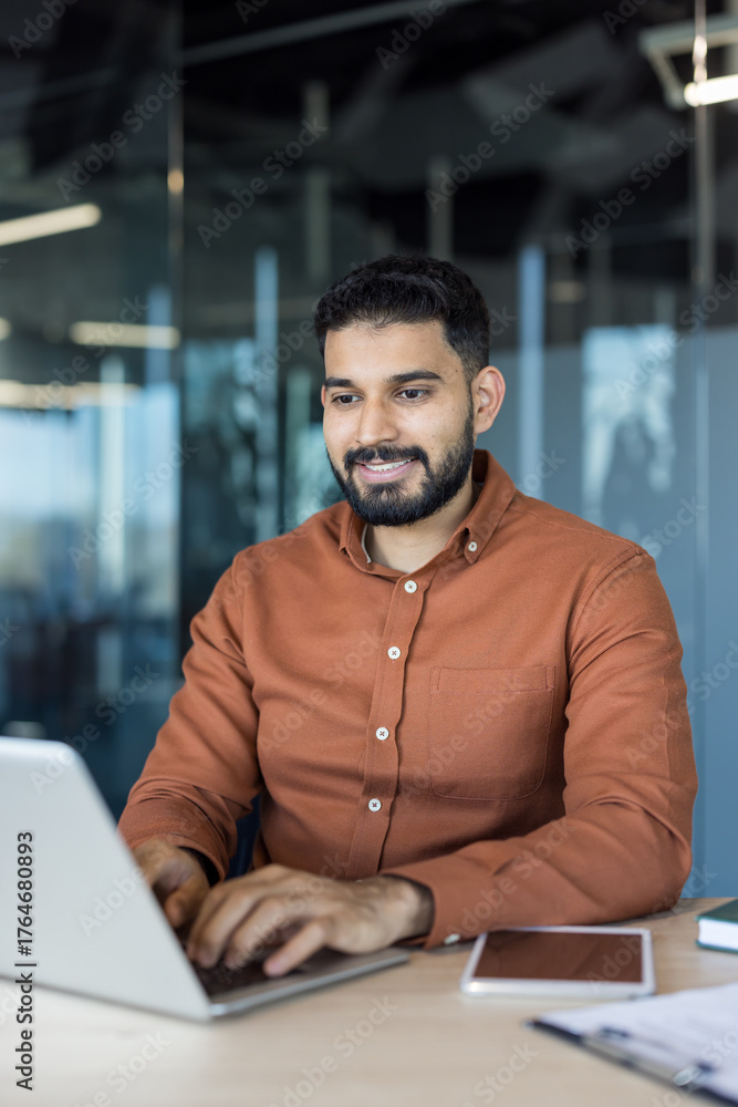 Plakat do Pokoju Dziewczynki - Indian businessman working on a laptop, standing at a desk in a contemporary office setting with... #1764680893