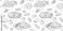 • Seamless pattern with cheese platter in doodle style with various gourmet pieces. Line art illustrations, camembert, cheddar, grapes on charcuterie board on white background