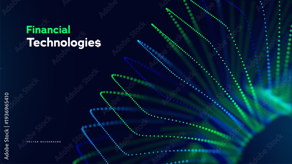 • Financial Technology Abstract Data Stack With Glowing Blue And Green Dots On Dark Background For Digital Banking, Blockchain And Innovation. Financial Technologies Concept. Vector Illustration.