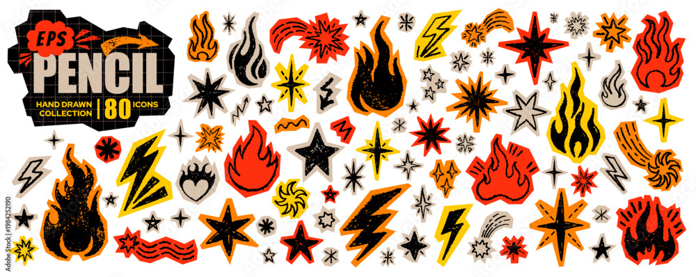 • Fire, flame, star, lightning hand drawn collage icon. Doodle scrapbook sticker. Vector brush crayon fire flame star bolt. Cutout grunge grafitti icon. Sketch vintage paper set. Tattoo Punk Rock hot bg