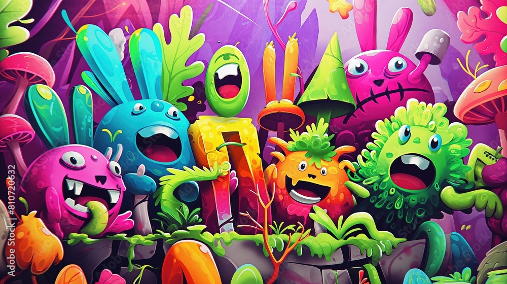 • Na obrazie widzimy grupę kreskówkowych postaci, które zostały namalowane w stylu graffiti. Postacie wydają się być częścią żywego świata i aktywnie współdziałać ze sobą
