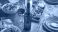Plakat do Restauracji - A bottle of red wine and a glass of wine are on a wooden table set for a dinner party with... #1030726999