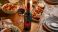 • A bottle of red wine and a glass of wine are on a wooden table set for a dinner party with plates, food, and candles.