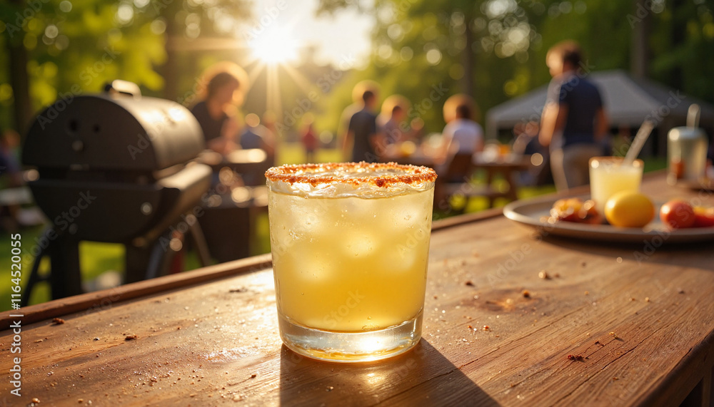 • Refreshing cocktail on wooden table at summer barbecue