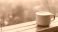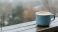 • cozy cup of cocoa resting on wooden balcony, inviting warmth and comfort