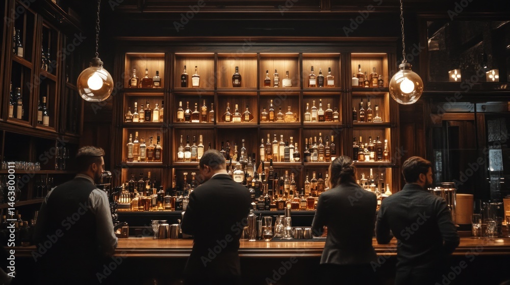 Plakat do Restauracji - Elegant bar scene with bartenders preparing drinks at night #1463800011