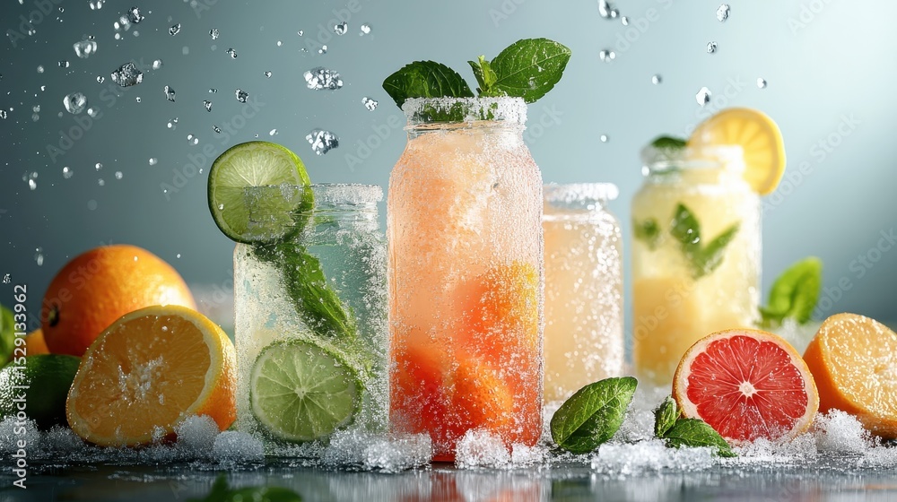 • A collection of refreshing sparkling citrus drinks, infused with mint and served in jars, beautifully arranged and splashing with droplets in a vibrant display.