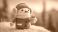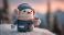 • Adorable knitted snowman toy with blue sweater and earmuffs holding hot cocoa mug on snowy surface at sunset. Cozy Christmas decoration, winter holiday concept for greeting card