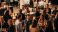 • A high-angle shot of a lively networking event. Professionally dressed people converse and mingle in a spacious, dimly lit venue. Drinks and appetizers are present.