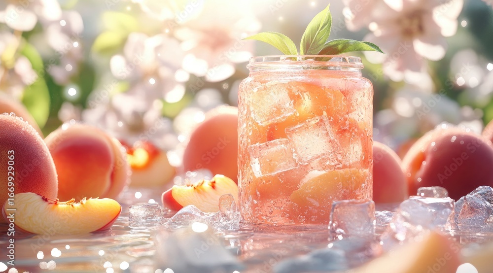 Plakat do Restauracji - Peach iced drink in jar, surrounded by fresh peaches #1669929063