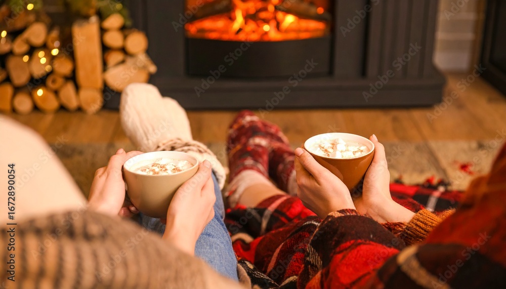 Plakat do Restauracji - A couple in cozy socks enjoys hot chocolate with marshmallows while relaxing by a warm fireplace. #1672890054