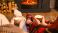 • A couple in cozy socks enjoys hot chocolate with marshmallows while relaxing by a warm fireplace.