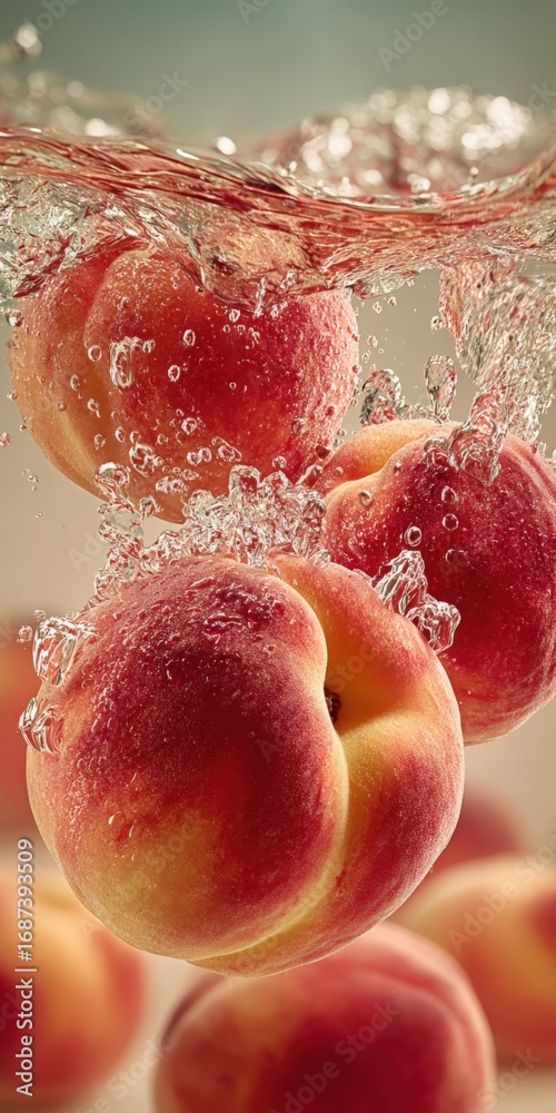 • Fresh peaches splashing into water, creating bubbles, a vibrant and refreshing image for summer food and beverage concepts