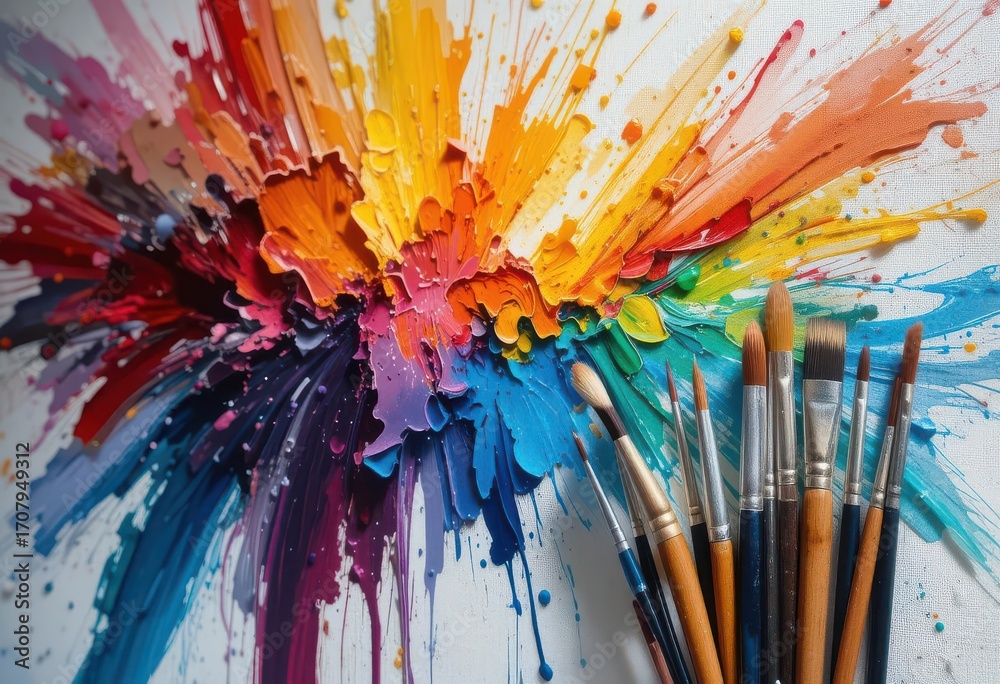 Plakat do Restauracji - Close up Still Life of Oil Paints Brushes Awaiting the Artist s Touch in a Sunlit Atelier. #1707949312