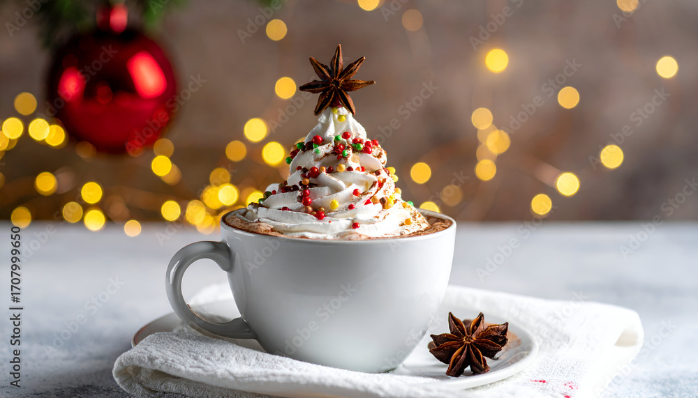 Plakat do Restauracji - Festive Hot Chocolate with Whipped Cream Christmas Tree and Star Anise. #1707999650