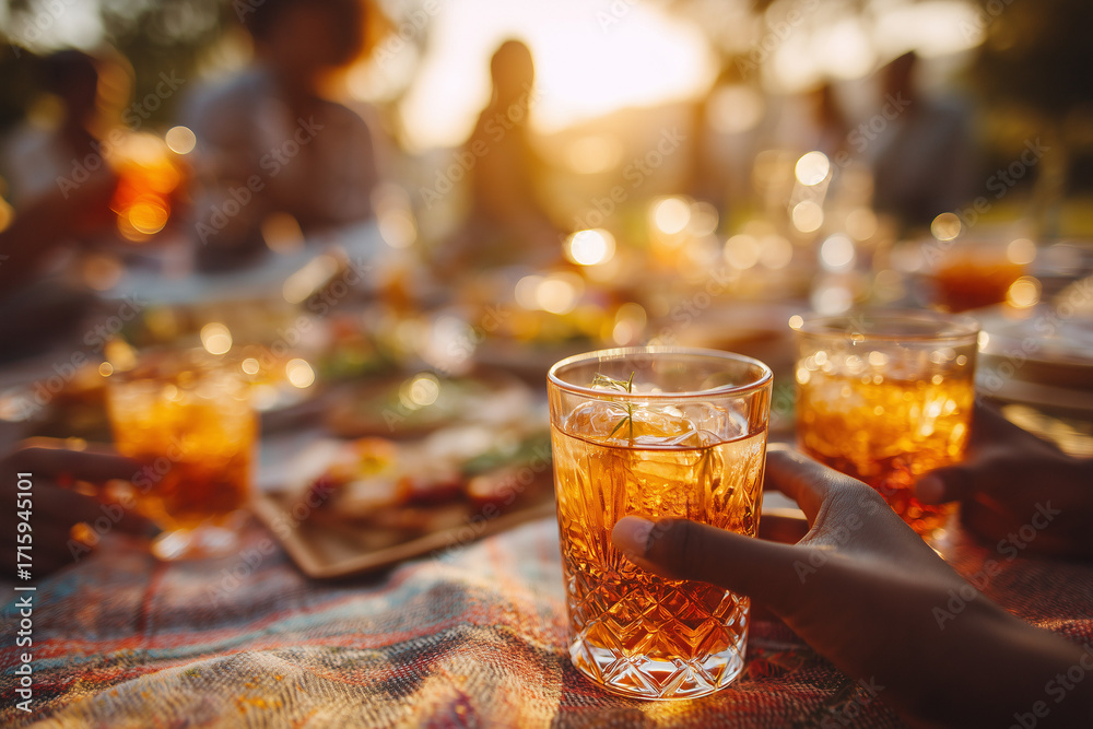 Plakat do Restauracji - People’s hands holding glasses of fruit punch, cheers gesture, picnic blanket in background,... #1715945101