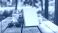 • Blank spiral-bound notebook sits on a wooden table outdoors, surrounded by drinks and sunglasses.