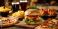 • The delicious spread of burgers, pizza, fries, and drinks on a wooden table.