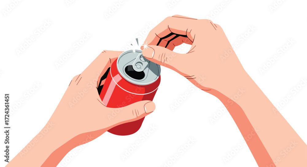 • Illustration displaying a pair of hands opening a red aluminium can, a representation of refreshment and easy accessibility with a clean and modern