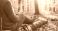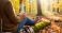 • Woman sitting on forest ground holding steaming coffee cup wrapped in plaid blanket. Cozy autumn moment with warm drink among golden fall leaves and trees in peaceful woodland setting.