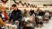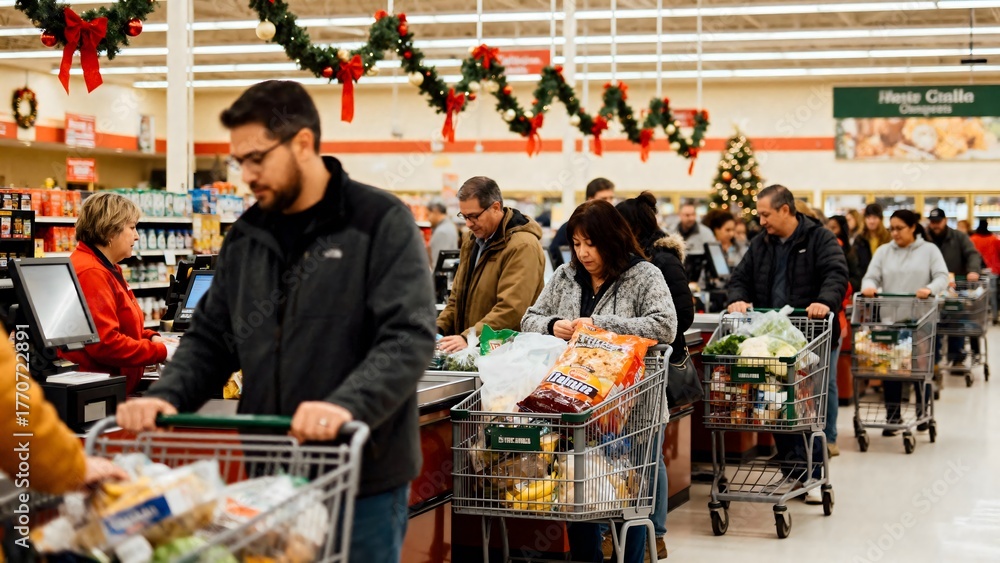 • Shoppers waiting in line with carts full of groceries during holidays
