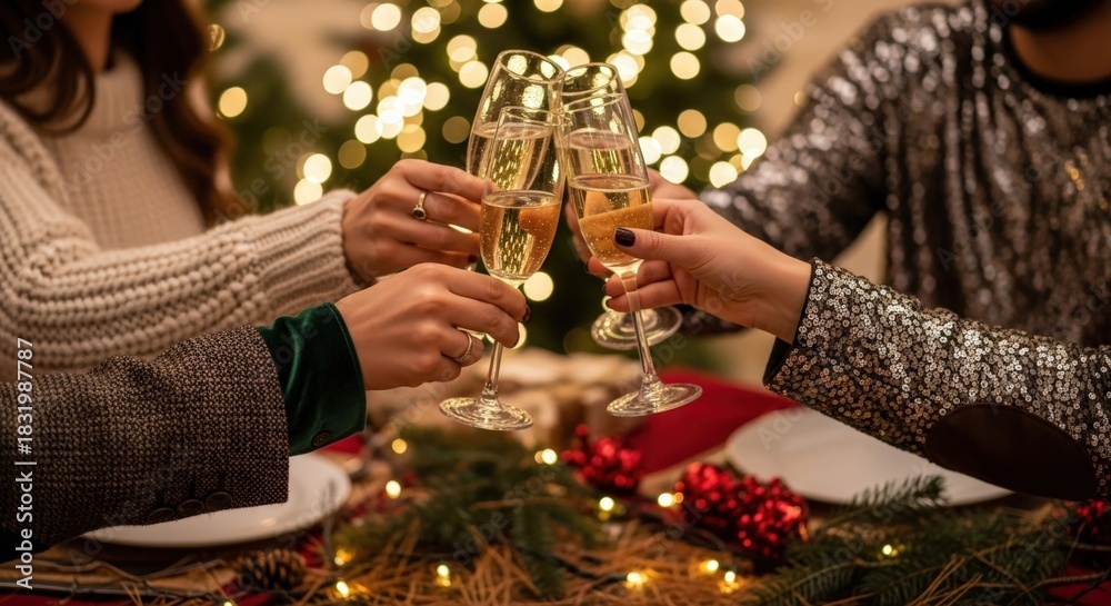 • Friends clinking champagne glasses at a christmas party